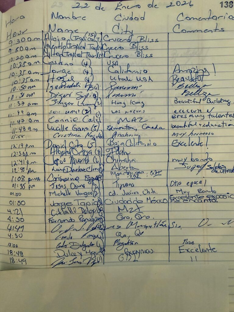 Para llevar un registro de las visitas, en las galerías se cuenta con un libro donde las personas anotan su nombre y el lugar de donde provienen. Este registro permite constatar la diversidad de visitantes que llegan a conocer estos espacios culturales en pleno Centro Histórico de Mazatlán.