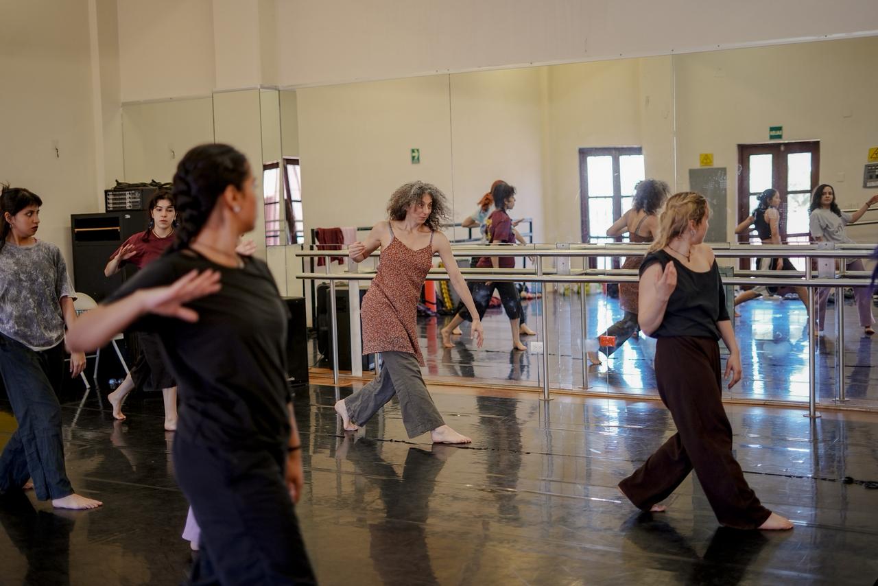 La creadora, quien concibe la danza como un arte visual, compartió parte de su enfoque pedagógico durante esta visita. Su interés estuvo centrado en iniciar un proceso de investigación física con las estudiantes, a partir de estructuras abiertas que permitieran construir material propio, relacionarse con el espacio de otra manera y profundizar en ejercicios coreográficos que vinculan forma, intención y presencia escénica.