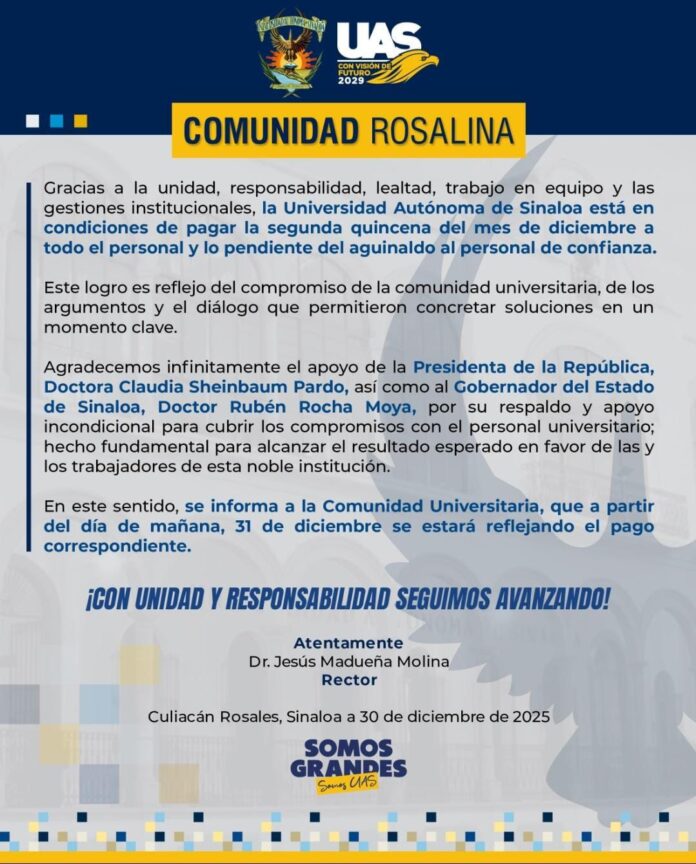 El rector de la Universidad Autónoma de Sinaloa (UAS), Jesús Madueña Molina, informó que este miércoles se realizará el pago del aguinaldo a los trabajadores de confianza, así como la segunda quincena correspondiente a todo el personal universitario.