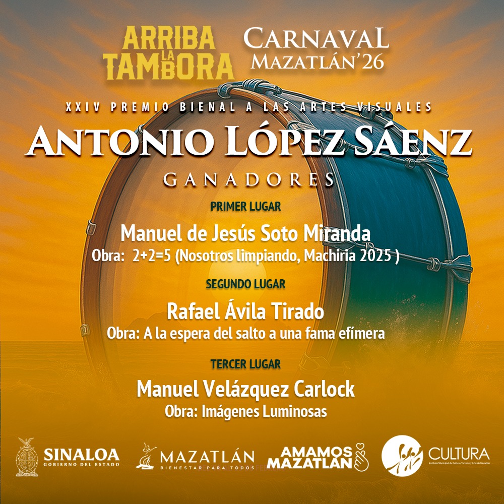 En una celebración que exalta la creatividad y el discurso visual contemporáneo, este lunes se dan conocer los resultados de la XXIV Edición del Premio Bienal a las Artes Visuales Antonio López Sáenz. El certamen, convocado por el Instituto Municipal de Cultura, Turismo y Arte de Mazatlán, en el marco del Carnaval, se ha consolidado como uno de los pilares para la promoción artística en el Noroeste de México.